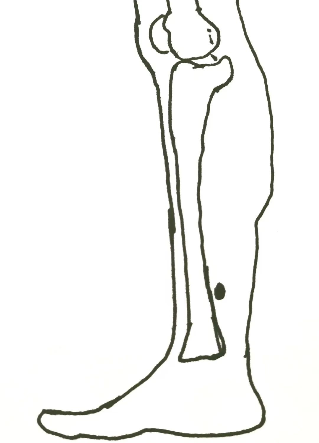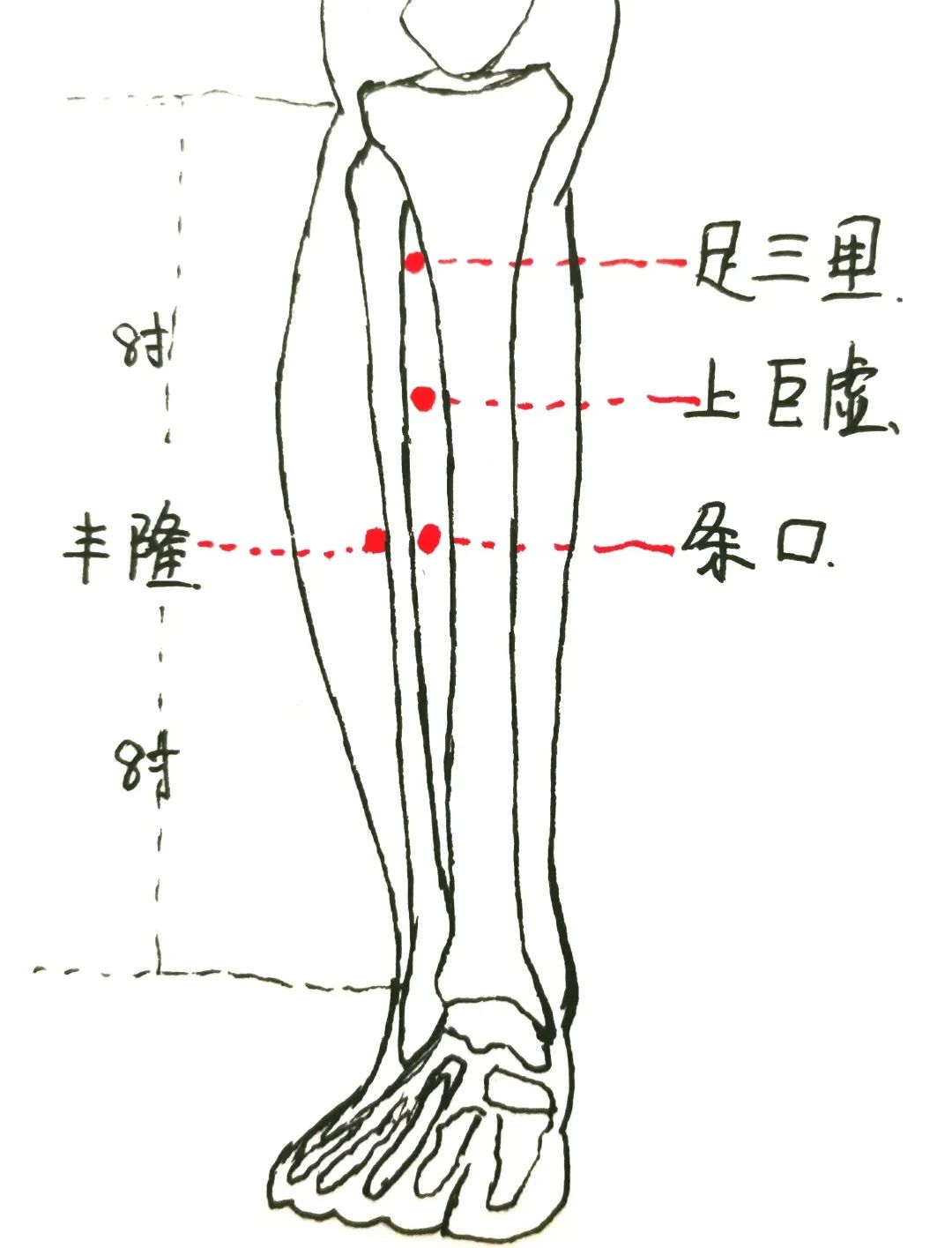 丰隆,在小腿前外侧,外踝尖上8寸,距离胫骨前缘2横指。外踝尖和膝中(腘横纹)之间为16寸,等分点就是外踝尖上8寸。