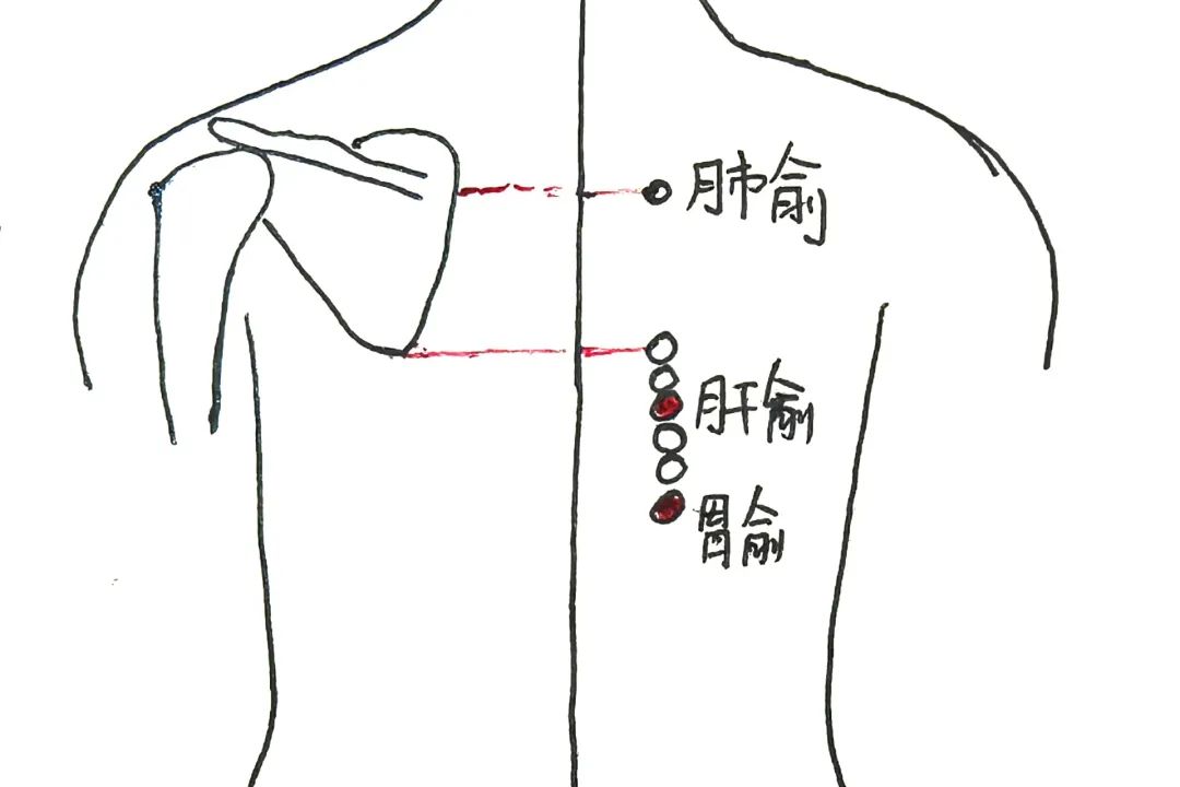 肝俞,在背部,第九胸椎棘突下旁开1.5寸。第九胸椎这样来找,肩胛骨下角横对第七胸椎棘突,咱们向下数两个胸椎棘突,下面的凹陷旁开1.5寸就是肝俞啦。肩胛骨内侧缘和脊柱之间为3寸,这样咱们也找到了脊柱旁1.5寸的位置,左右各一个穴位。