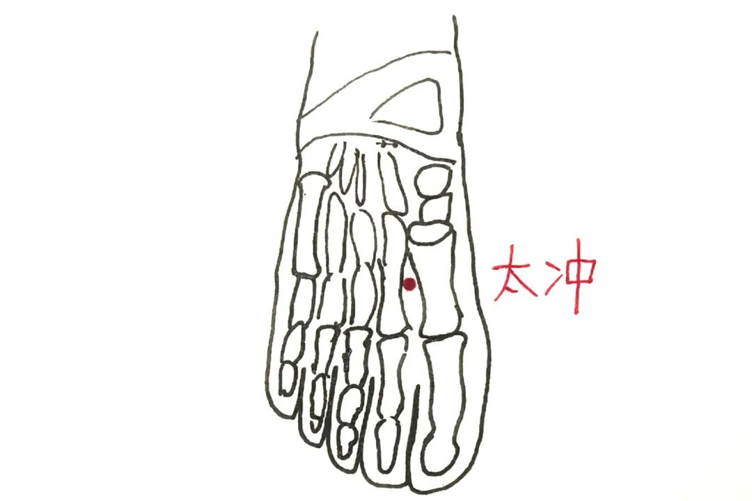 太冲,太冲穴在脚背上,大脚趾和二脚趾之间后方的凹陷中。