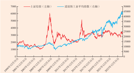 图3 1999—2023年上证综指与道琼斯工业平均指数的走势对比