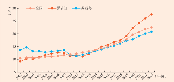 图2 2002—2023年不同省份之间老龄化程度的比较