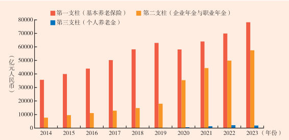 图1 2014—2023年中国养老保险三支柱规模比较